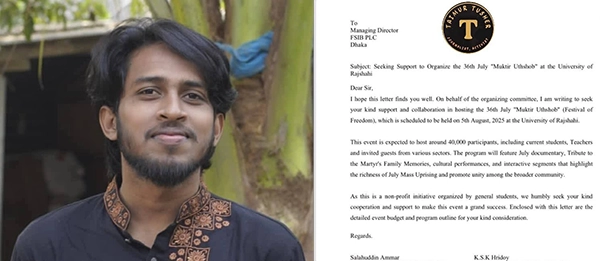 বৈষম্যবিরোধী ছাত্র আন্দোলনের রাজশাহী বিশ্ববিদ্যালয় শাখার সাবেক সমন্বয়ক সালাউদ্দিন আম্মারের উদ্যোগে আয়োজিত ‘৩৬ জুলাই: মুক্তির উৎসব’ অনুষ্ঠানকে কেন্দ্র করে শুরু হয়েছে বিতর্ক। এই আয়োজনের জন্য বিভিন্ন প্রতিষ্ঠান ও সংস্থার কাছে আর্থিক অনুদান চেয়ে পাঠানো চিঠিকে ঘিরে শুরু হয়েছে আলোচনা-সমালোচনা। চিঠিতে রাজশাহী বিশ্ববিদ্যালয়ের ভিসি অধ্যাপক ড. সালেহ্ হাসান নকীব ‘স্ট্রংলি রিকমেনডেড’ মন্তব্য করে সুপারিশ করেন। এ নিয়ে ওঠে সমালোচনার ঝড়। দেখা যায়, কোনো প্রতিষ্ঠানে ইংরেজিতে প্রস্তাবনা দেয়া হয়েছে, কোনোটিতে বাংলায়। চিঠির সঙ্গে অনুষ্ঠান এবং বাজেটের বিস্তারিত যুক্ত করে দেয়া হয়। বাংলায় করা একটি আবেদনে বলা হয়েছে, ‘রাজশাহীর গৌরবময় ইতিহাসে ৩৬ জুলাই একটি স্মরণীয় দিন। এই দিনটি আমরা ‘জুলাই আন্দোলন’ হিসেবে স্মরণ করি, যেখানে বহু তরুণ শহীদ হয়েছিলেন এবং অনেকে আহত হয়েছিলেন গণতান্ত্রিক অধিকারের সংগ্রামে। এই ঐতিহাসিক ঘটনার এক বছর পূর্তি উপলক্ষে আমরা আয়োজন করতে যাচ্ছি ‘৩৬ জুলাই: মুক্তির উৎসব। এই উৎসবে রাজশাহীর শহীদ পরিবার, আহতদের পরিবার, গণ্যমান্য ব্যক্তিবর্গ এবং সম্মানিত সমন্বয়কবৃন্দ উপস্থিত থাকবেন।