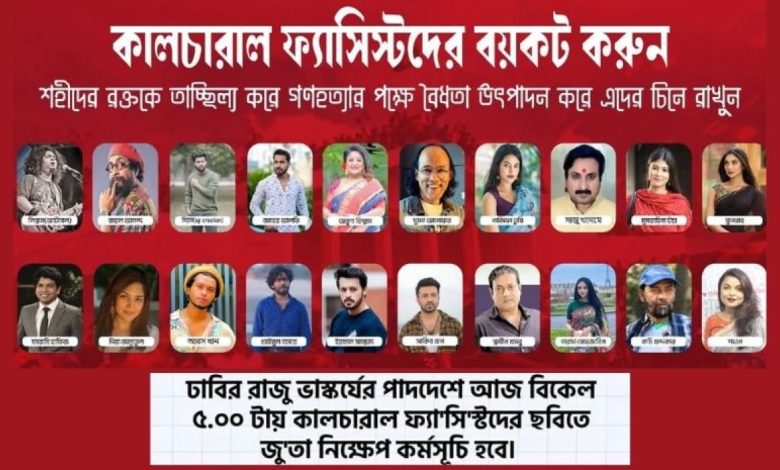 এছাড়া, পোস্টারে ‘কালচারাল ফ্যাসিস্ট’ আখ্যা দেওয়া ব্যক্তিদের নামসহ ছবি যুক্ত করা হয়। এতে গায়ক লিঙ্কন (আর্টসেল), রাহুল আনন্দ, সিয়াম (এসপি ক্রিয়েশন), জাহের আলভি, অরুণা বিশ্বাস, সুমন আনোয়ার, নাজিফা তুষি, সাজু খাদেম, মুমতাহিনা টয়া, সুনেরাহ, ফারাবি হাফিজ, পিয়া জান্নাতুল, আরস খান, খাইরুল বাসার, ইরফান সাজ্জাদ, সাকিব খান, স্বাধীন, পারসা মেহেজাবিন, কচি খন্দকার এবং মেহের আফরোজ শাওনের নাম দেখা যায়। এর বাইরেও আরও অনেককে কালচারাল ফ্যাসিস্ট আখ্যায়িত করে বয়কটের ডাক দিচ্ছেন বিক্ষুব্ধ ছাত্র-জনতা।