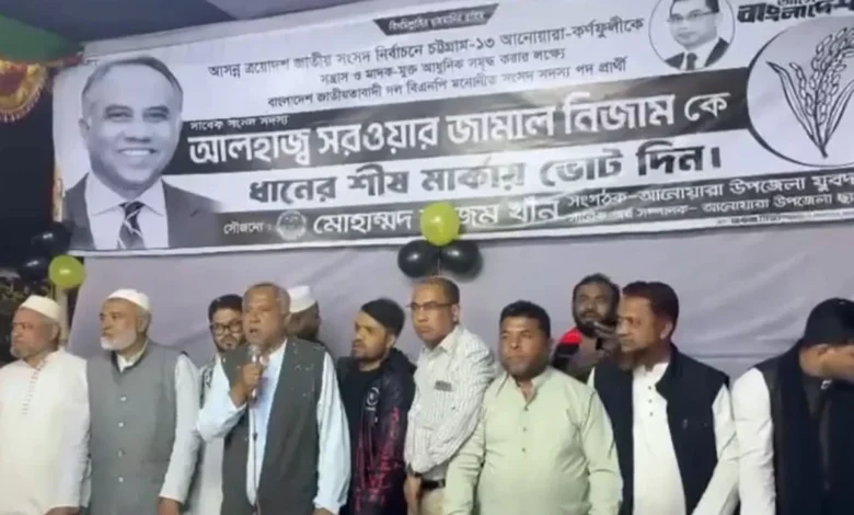 চট্টগ্রাম-১৩ (আনোয়ারা–কর্ণফুলী) আসনে বিএনপির প্রার্থী সরওয়ার জামাল নিজাম আগামী ১২ তারিখ পর্যন্ত চাঁদাবাজি না করার জন্য দুই হাত জোড় করে অনুরোধ জানিয়েছেন। শুক্রবার রাত ৯টার দিকে আনোয়ারা উপজেলার চাতুরী চৌমুহনী বাজারে তার নির্বাচনি কার্যালয় উদ্বোধনকালে দেওয়া এক বক্তব্যে তিনি এই অনুরোধ জানান। পরে বক্তব্যের ৫৫ সেকেন্ডের একটি ভিডিও সামাজিক যোগাযোগমাধ্যমে ছড়িয়ে পড়লে তা নিয়ে আলোচনা-সমালোচনা শুরু হয়।
