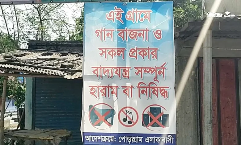 স্থানীয়রা বলছেন, বিয়েবাড়ি, বোনভজন বা দিবস উদ্‌যাপনসহ কোনো আয়োজনে গান বা বাদ্যযন্ত্র বাজানো যাবে না। সমাজ রক্ষা কমিটির সদস্যরা বাড়ি বাড়ি গিয়ে ওই সময় এমন নোটিস জারি করেন। গ্রামের মানুষ তো নয়ই, বাইরে থেকে আসা ফেরিওয়ালারাও গান বাজাতে পারে না এই গ্রামে।