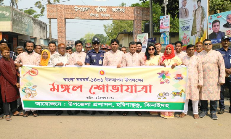 ঝিনাইদহ, ১৪ এপ্রিল: আজ রবিবার, ১৪ই এপ্রিল, ঝিনাইদহের হরিণাকুন্ডু উপজেলা প্রশাসন কর্তৃক আয়োজিত এক বর্ণাঢ্য মঙ্গল শোভাযাত্রায় বাংলা নববর্ষ ১৪৩১ বঙ্গাব্দ উদযাপন করা হয়েছে। সকাল ৯:৩০ টায় উপজেলা দোয়েল চত্বর থেকে শুরু হওয়া এই শোভাযাত্রা একতারা মোড় হয়ে আবার দোয়েল চত্বরে ফিরে আসে।