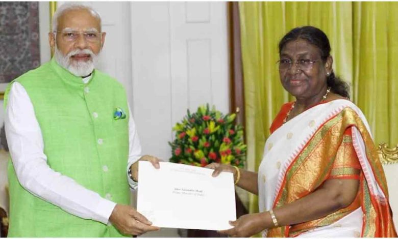 নতুন সরকার গঠনের লক্ষ্যে ভারতের প্রধানমন্ত্রী নরেন্দ্র মোদি রাষ্ট্রপতি দ্রৌপদী মুর্মুর কাছে পদত্যাগপত্র জমা দিয়েছেন। বুধবার দিল্লিতে রাষ্ট্রপতি ভবনে দ্রৌপদী মুর্মুর সঙ্গে সাক্ষাৎ করে এই পদত্যাগপত্র জমা দিয়েছেন তিনি। শরীক দলগুলো বিজেপি নেতৃত্বাধীন এনডিএ জোটের সঙ্গে থেকে সরকার গঠনের প্রতিশ্রুতি দেওয়ায় বুধবার পদত্যাগ করেছেন নরেন্দ্র মোদি।