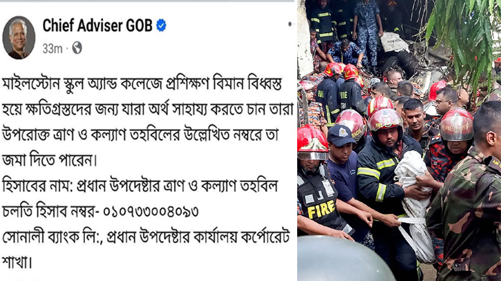 ওই পোস্টে লেখা হয়, “মাইলস্টোন স্কুল অ্যান্ড কলেজে প্রশিক্ষণ বিমান বিধ্বস্ত হয়ে ক্ষতিগ্রস্তদের জন্য যারা অর্থ সাহায্য করতে চান তারা উপরোক্ত ত্রাণ ও কল্যাণ তহবিলের উল্লেখিত নম্বরে তা জমা দিতে পারেন।”