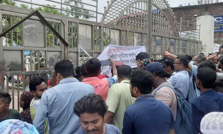 বুধবার (২৩ জুলাই) সরেজমিনে ঘুরে দেখা যায়, সকাল থেকে ফাঁকা থাকলেও বেলা বাড়ার সঙ্গে সঙ্গে মানুষ জড়ো হতে থাকেন। কেউ মোবাইল ফোনে ছবি তুলছেন, কেউ ভিডিও করছেন। গণমাধ্যমের ক্যামেরাগুলো স্থির হয়ে আছে তালাবদ্ধ সেই গেটের দিকে। মাঝে মধ্যে ভেতর থেকে কেউ বের হলে ছুটে যাচ্ছে ক্যামেরা আর মাইক্রোফোন।