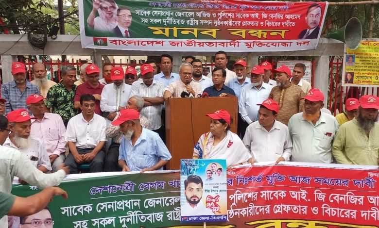 রোববার (৯ জুন) দুপুরে জাতীয় প্রেস ক্লাবের সামনে এক মানববন্ধনে এসব কথা বলেন তিনি। জাতীয়তাবাদী মুক্তিযোদ্ধা দলের উদ্যোগে সাবেক সেনাপ্রধান জেনারেল আজিজ ও পুলিশের সাবেক আইজিপি বেনজীর আহমেদসহ দুর্নীতিবাজ রাষ্ট্রীয় সম্পদ লুণ্ঠনকারীদের গ্রেপ্তার ও বিচারের দাবিতে এই কর্মসূচি পালন করা হয়।